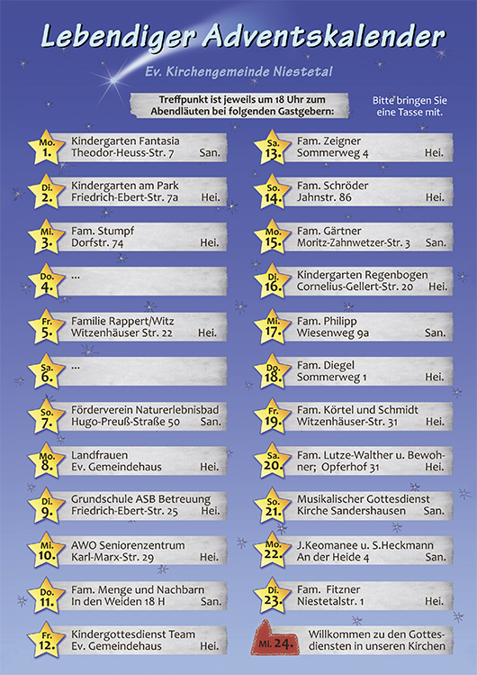 Den aktuellen Gottesdienstplan für die Kirchen in Heiligenrode und Sandershausen finden Sie hier: